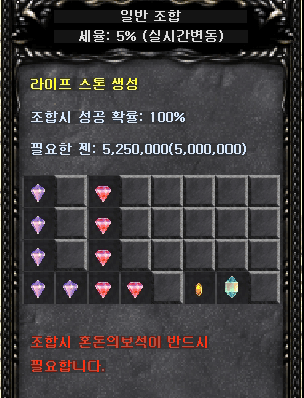 - Life Stone formulė = Jewel of Bless 5 + Jewel of Soul 5 + Jewel of Guardian 1 + Jewel of Chaos 1 + 5M zen
